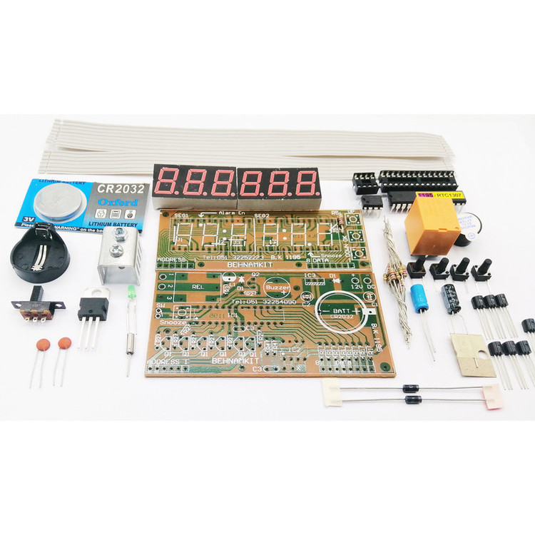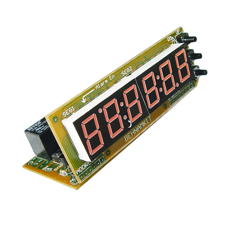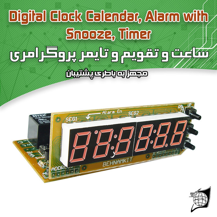 يک ساعت ديجيتالي با قابليت نمايش ساعت و تاريخ با امکانات فراوان و جالب بسازيد. ● در اين مدار از آيسي ساعت به شماره DS1307 که داراي ساعت و تقويم است، ميکروکنترلر Atmega8 ، نمايشگر 6 رقمي و سه عدد شاسي براي تنظيم راحت، استفاده شده است. ● اين مدار داراي آي سي RTC که مخفف Real time clock بوده که براي محاسبه زمان دقيق از آن استفاده مي شود . يک باتری Back up سکهاي نيز از عقبماندن ساعت به هنگام قطع شدن برق حفاظت ميکند. ● اين كيت يكي از جالبترين و انعطاف پذيرترين مدارات ساعت، تقويم و تايمر برنامهپذير ميباشد كه توسط واحد طراحي بهنام كيت و با استفاده از ميكروكنترلر Atmega8 از خانوادهAVR اتمل که دقت بالاتري نسبت به انواع مشابه ميباشد، توليد و عرضه شده است.