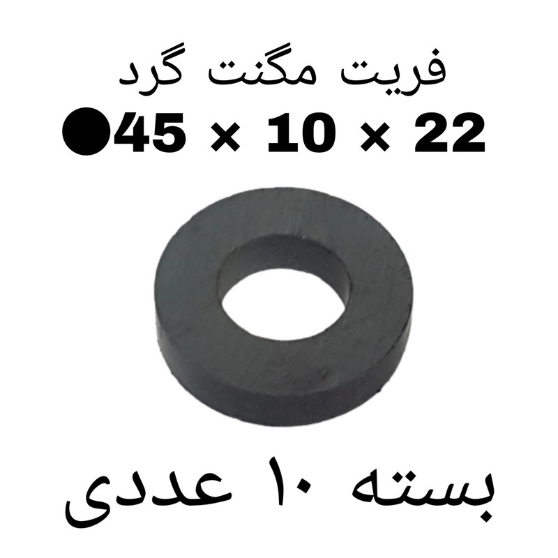 سایر توضیحات: آهن ربای فریت گرد قطر ۴۵ میلیمتر و ضخامت ۱۰ میلیمتر و سوراخ ۲۲ میلیمتر