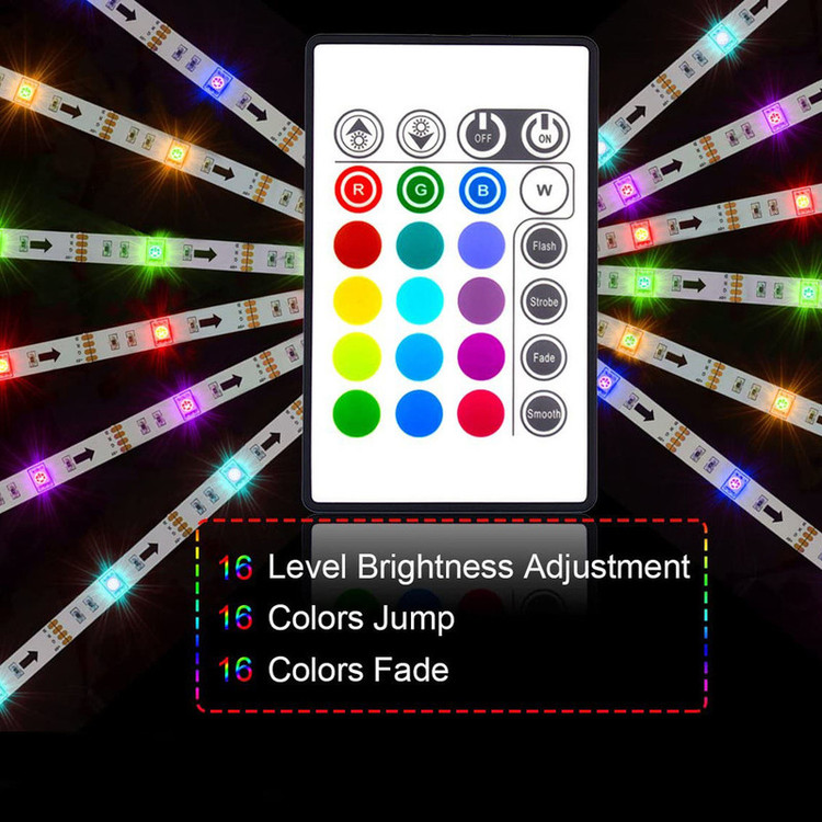 قابل استفاده برای تلویزیون های 40 تا 60 اینچ نور پردازی بسیار زیبا 16 رنگ مختلف نور استفاده از ریسه روکش دار برای ایمنی بیشتر دارای ریموت کنترل بدون نیاز به نصاب بی خطر آداپتور 5 آمپری طول سیم آداپتور 140 سانتیمتر