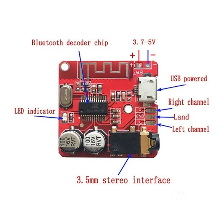 پس از اتصال تغذیه 3.7 یا 5 ولت به ماژول ال ای دی نشانگر آبی رنگ روشن شده و بلوتوث اماده جفت شدن با دستگاه خارجی می شود پس از جفت شدن می توانید موسیقی خود را پخش کنید