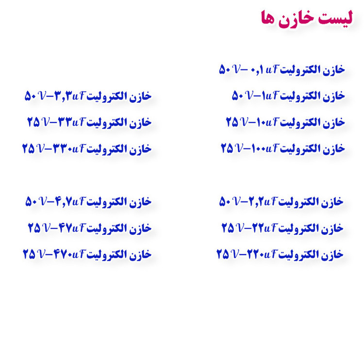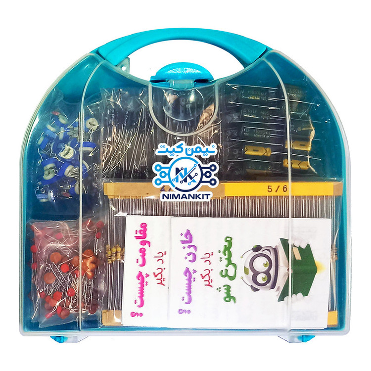 خازن ها و مقاومت ها از اجزای جدایی ناپذیر همه ی پروژه های الکترونیکی محسوب میشوند. حتما برای شما نیز پیش آمده است که برای ساخت مدار های مختلف نیاز به خازن یا مقاومت های مختلف داشتید و گاها برای تهیه یک خازن یا یک مقاومت مجبور به طی مسافت طولانی شده اید . این پک 13 رنج خازن الکترولیتی ، 42 رنج خازن عدسی ، 78 رنج مقاومت 1/4 وات و 7 رنج پتانسیومتر را در خود دارد و تقریبا اکثر مقاومت ها و خازن های پر کاربرد و متداول موجود در بازار را در خود دارد می شود . در این پک خازن ها به صورت دسته بندی شده بسته بندی شده اند و مقدار تک تک مقاومت ها روی نوار مقاومت ها درج شده است و نیاز به بررسی نخواهید داشت ، همچنین مقاومت ها بر اساس دو رقم اول دسته بندی شده اند . === » همراه این مجموعه دفترچه راهنمای «خازن چیست» و «مقاومت چیست » وجود دارد که شما را با انواع خازن ها و مقاومت ها و روش خواندن آنها آشنا می کند . این پک توسط نیمن کیت جمع آوری و مرتب شده و داخل یک کیف پلاستیکی قرار داده شده اند که مانع از هم پاشیدگی آنها خواهد شد .