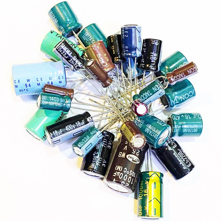 100 عدد انواع خازن الکترولیتی در ولتاژهای 6.3 و 10 و 25 و 35 و 50 و 400 و 63 از 1 میکروفاراد تا 1000 میکروفاراد