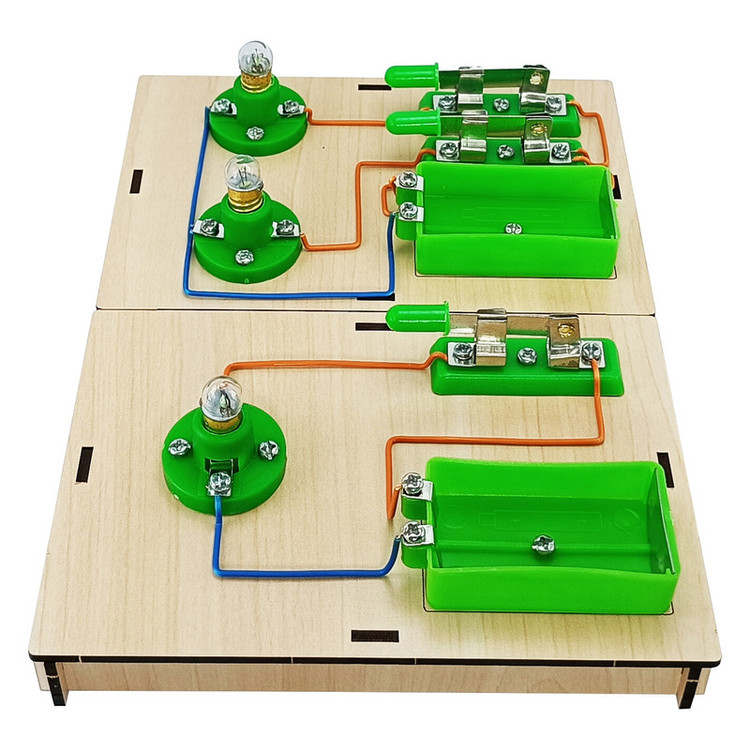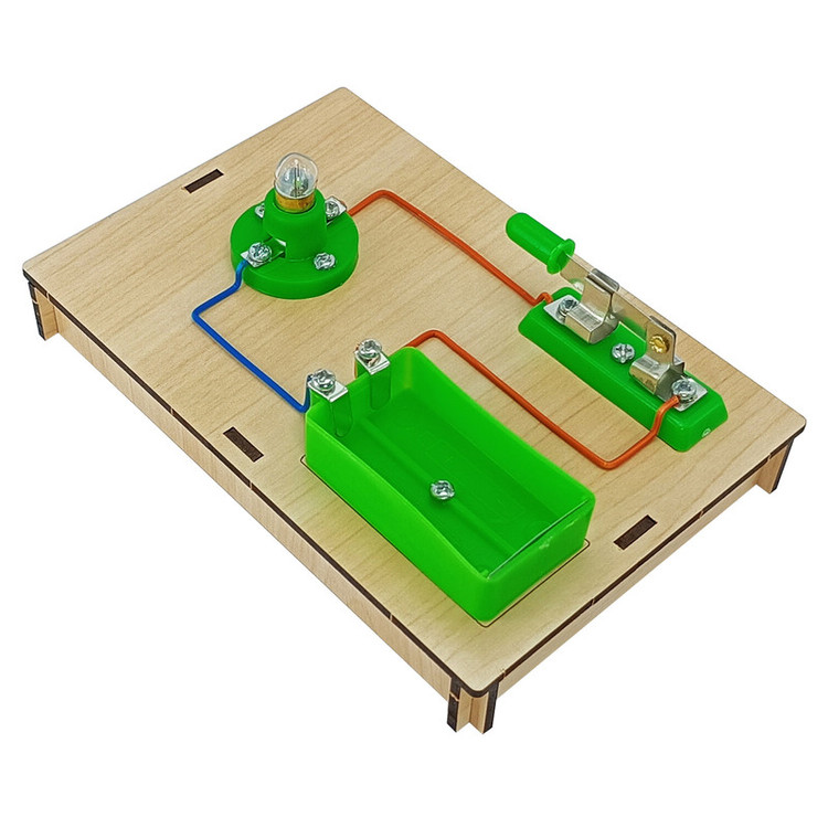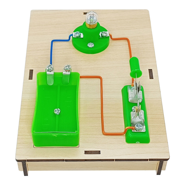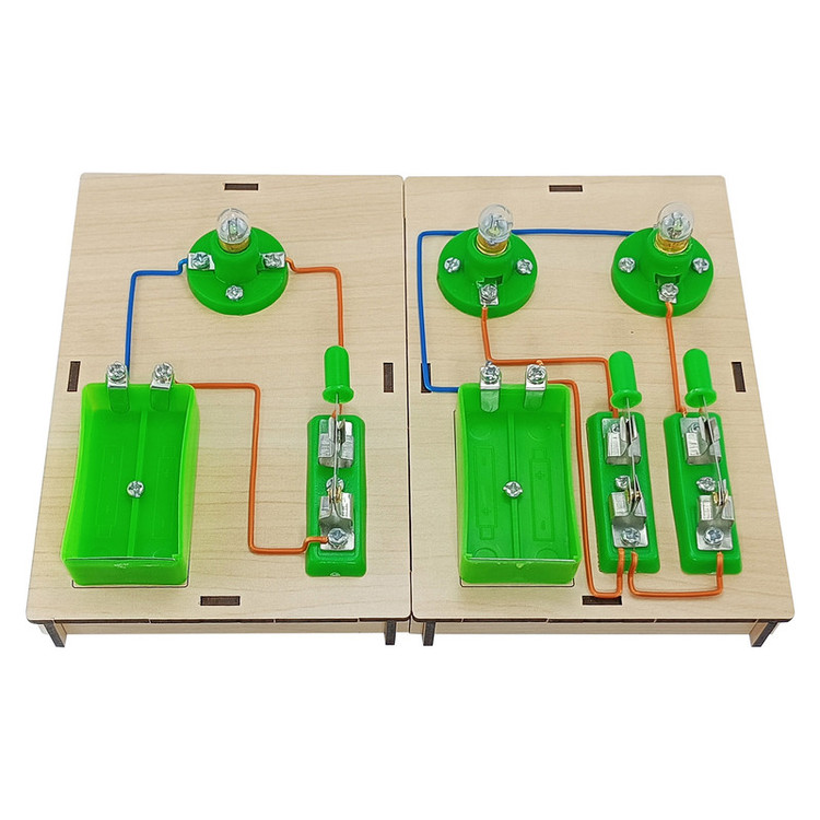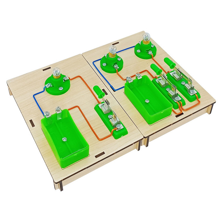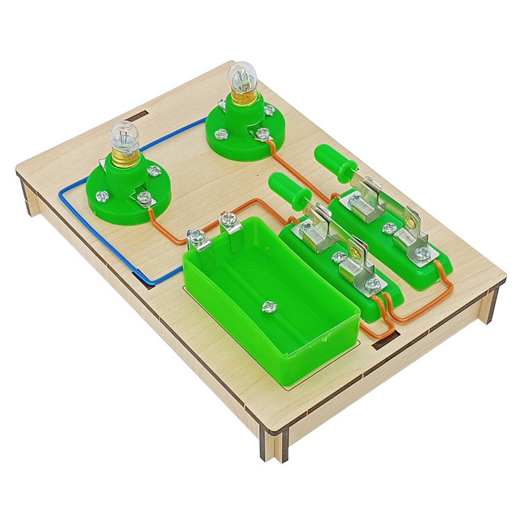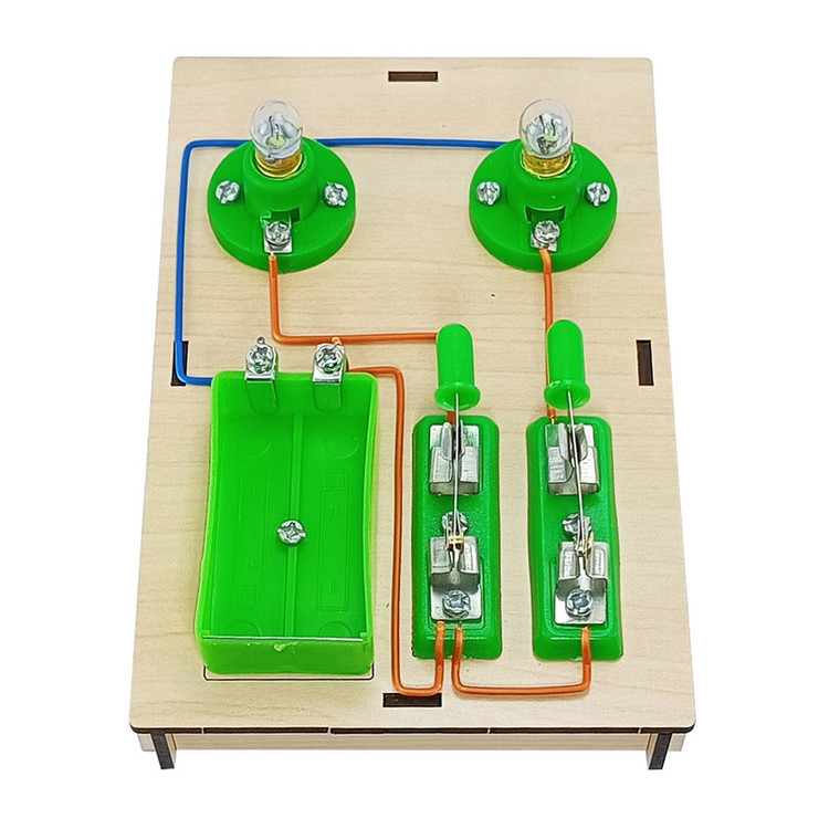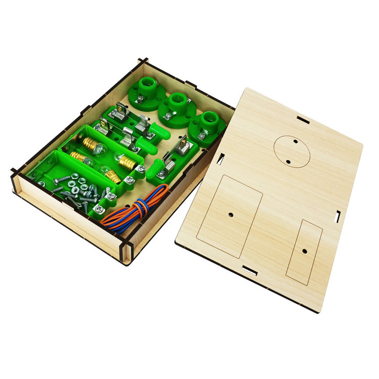 دو عدد پایه ، دو عدد جا باتری ، سه عدد سرپیچ ، سه عدد کلید ، 3 عدد لامپ ، مقداری سیم و پیچ و مهره